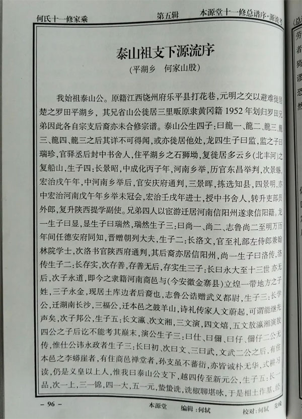 本源流序说何泰山祖籍江西饶州府乐平县打鼓巷,在元明之交,避难迁居罗田,生四子,龙四生子一监,监生瑞珍,居罗田平湖乡之石狮坳。又迁多云乡(北丰河)之复船山。生四子,即何景明兄弟四人,并且此四人才是信阳始迁祖。