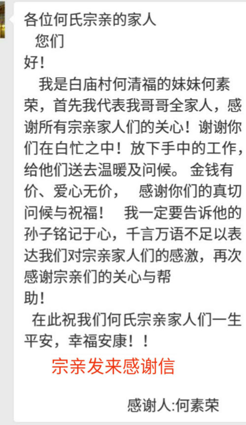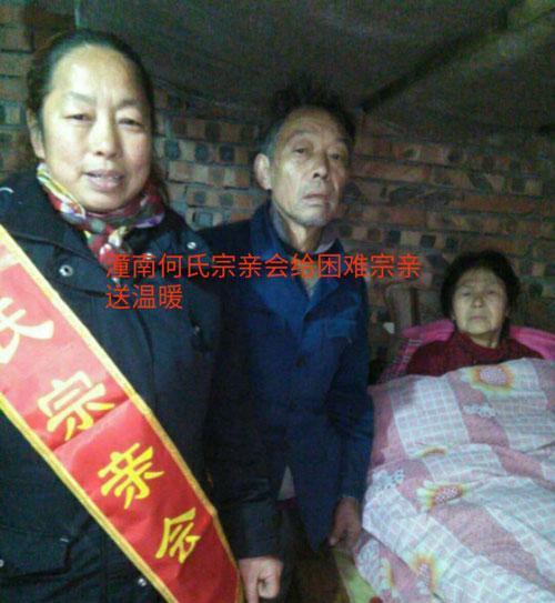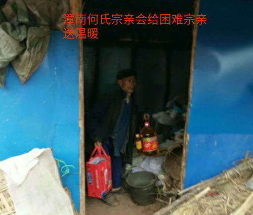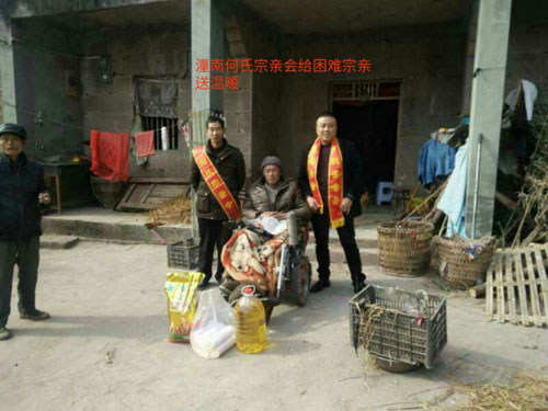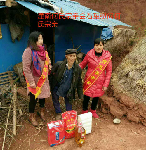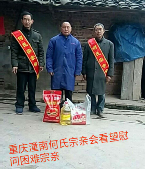 节前慰问送温暖,浓浓情意漾潼南。2018年2月1日-4日,在新春佳节即将来临之际,重庆潼南何氏宗亲在何宗泽的安排下,派出宗亲会成员,何贵华、何旭、何代斌、何文勇、何沿、何佳、何国安、何小华、何秋明等宗亲在重庆市潼南区开展春节前走访何氏贫困户慰问活动,为他们送去慰问物资,并致以问候和新春祝福,让他们在寒冬中感受到“何氏一家亲的温暖”。