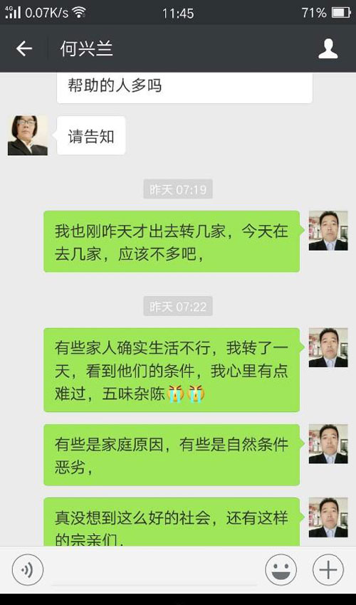 两天来,何子祥穿行在陕北黄土高原的大山里,在到访的六户宗亲家里看到,各有各的不幸和困难;虽然改革的春风早已惠及了千万家庭,但几户依然生活在贫困线上的何氏宗亲,他的心情愈发的沉重和肩上责任更加的重大。何子祥、何保平几个会长身体力行、不计得失、率先垂范,希望组织何氏宗亲的每个有能力的人都献出一已之力,汇成一条涓涓流淌的爱心之河。
